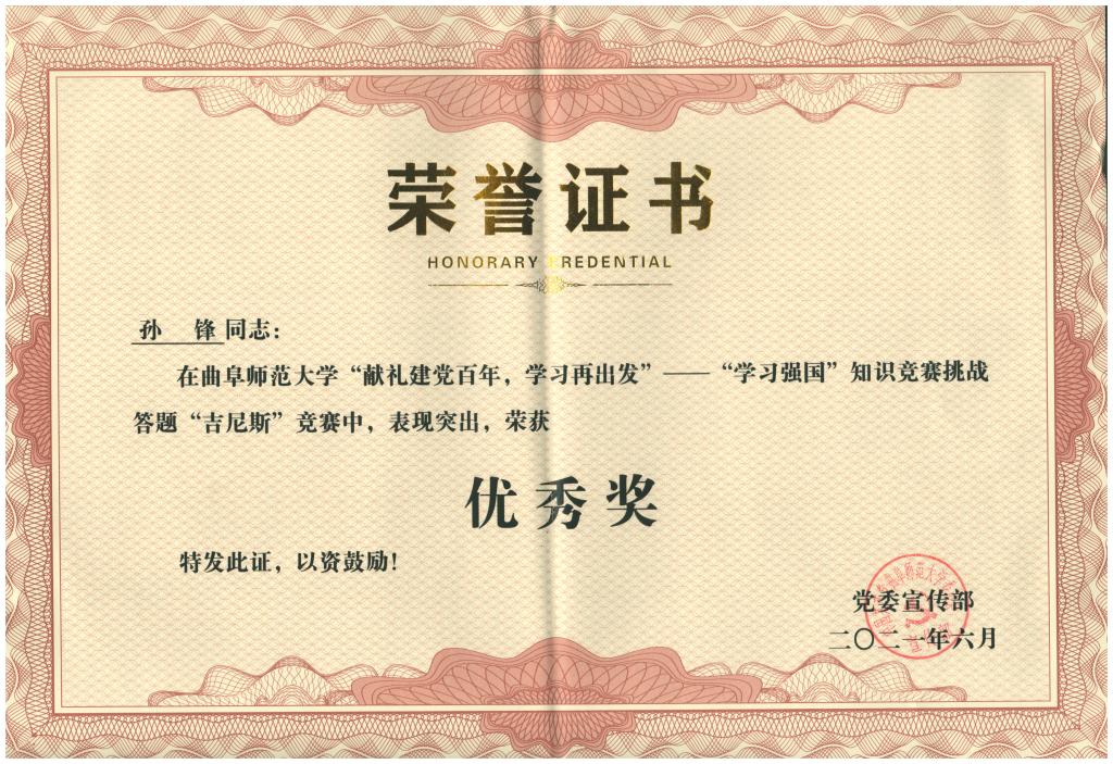 在本次活动的“学习强国”双周积分排名赛中,足球直播515官网 党委以56.44的平均分取得了全校第一的好成绩,同时,足球直播515官网 孙锋老师在“学习强国”挑战答题“吉尼斯”中荣获优秀奖。