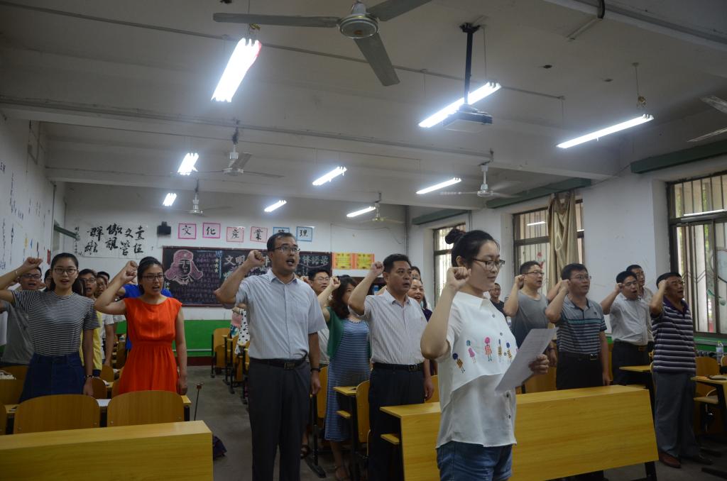 庄严肃穆的国际歌奏毕,活动开始第一项议程——重温入党誓词。全体党员在学生党支部宣传委员周玉洁的带领下,面对党旗,一字一句重温誓词。随后,党委书记尹明法发表讲话。尹书记指出,在七月一日这个神圣的日子重温入党誓词,对于广大党员同志认清党员身份、牢记入党动机、履行党员义务、践行党员使命具有重要意义。尹书记还向大家简要介绍了上周济宁市“两学一做”督导组来院督导情况,并要求与会党员同志在平时,尤其是在即将到来的暑假期间,一定要自觉自主的按照“两学一做”学习教育计划认真学习。