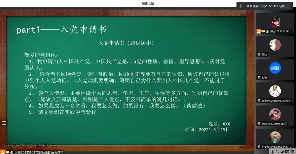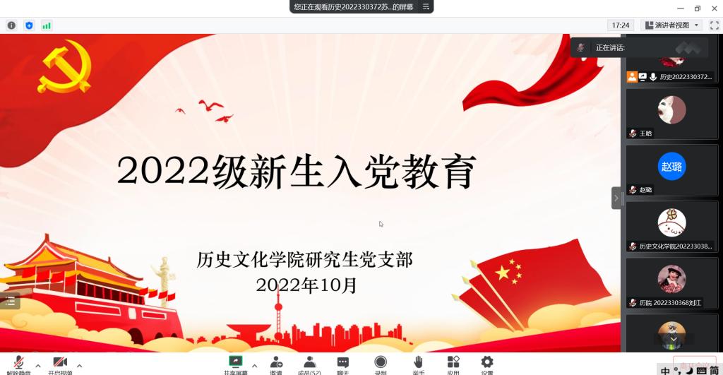 10月2日下午,足球直播515官网 研究生党支部通过腾讯会议平台开展了线上新生入党教育活动,研究生党支部书记孙锋同志、组织委员赵璐同志及2022级新生同学们共同参加线上会议。