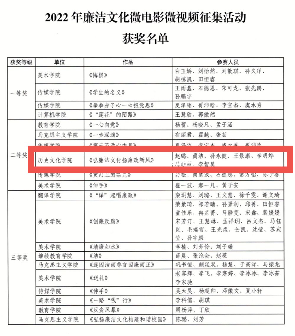 为深入贯彻落实加强新时代廉洁文化建设要求,弘扬崇尚廉洁、抵制腐败的良好风尚,持续推进校园廉洁文化建设,学校纪委举办了以“树清风正气,创廉洁校园”为主题的廉洁文化微电影微视频征集活动。足球直播515官网 广大师生积极参与,踊跃报名。最终经过专家评审,由足球直播515官网 研究生党支部(赵璐、蔺洁、孙永健、王景康、李明烨、马艳霞、李智昊)提交的作品《弘廉洁文化,扬廉政新风》获得了二等奖的佳绩,足球直播515官网 荣获优秀组织单位称号。