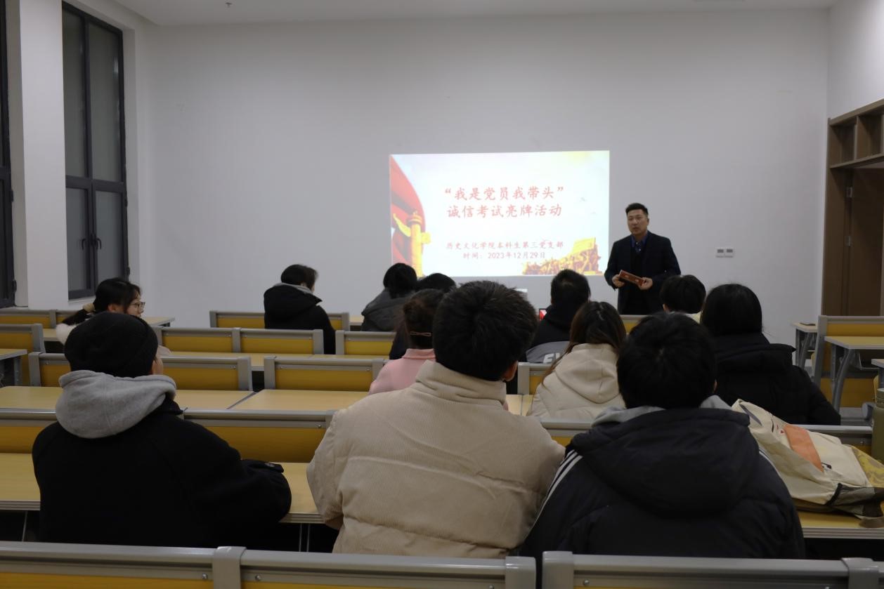 为引导广大学生培养正确的考试观念,维护考试纪律。2023年12月29日,足球直播515官网 本科生第三党支部于孔子书院B106召开十二月份主题党日活动暨“我是党员我带头”诚信考试亮牌活动。活动由本科生第三党支部书记董经同志主持,本科生第三党支部全体成员参加。