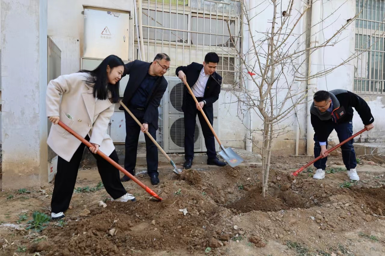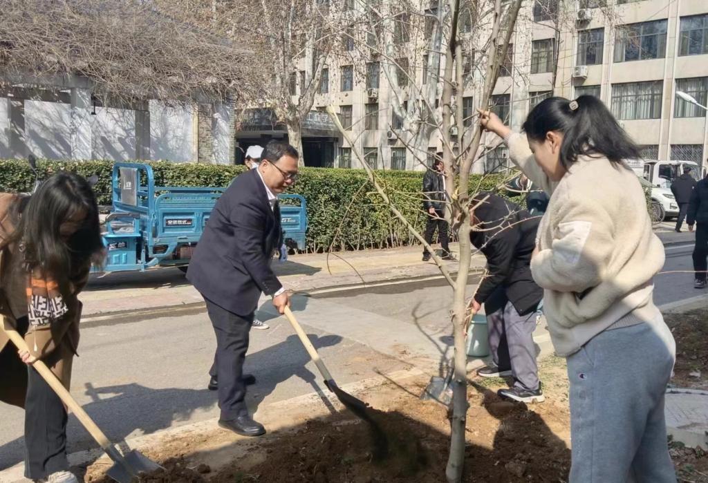 植树现场,同志们热情高涨,大家运苗、培土、扶树、踩实、浇水,各个环节衔接有序、分工明确,新栽种的苗木迎风挺立,为校区增添了绿色的氛围。