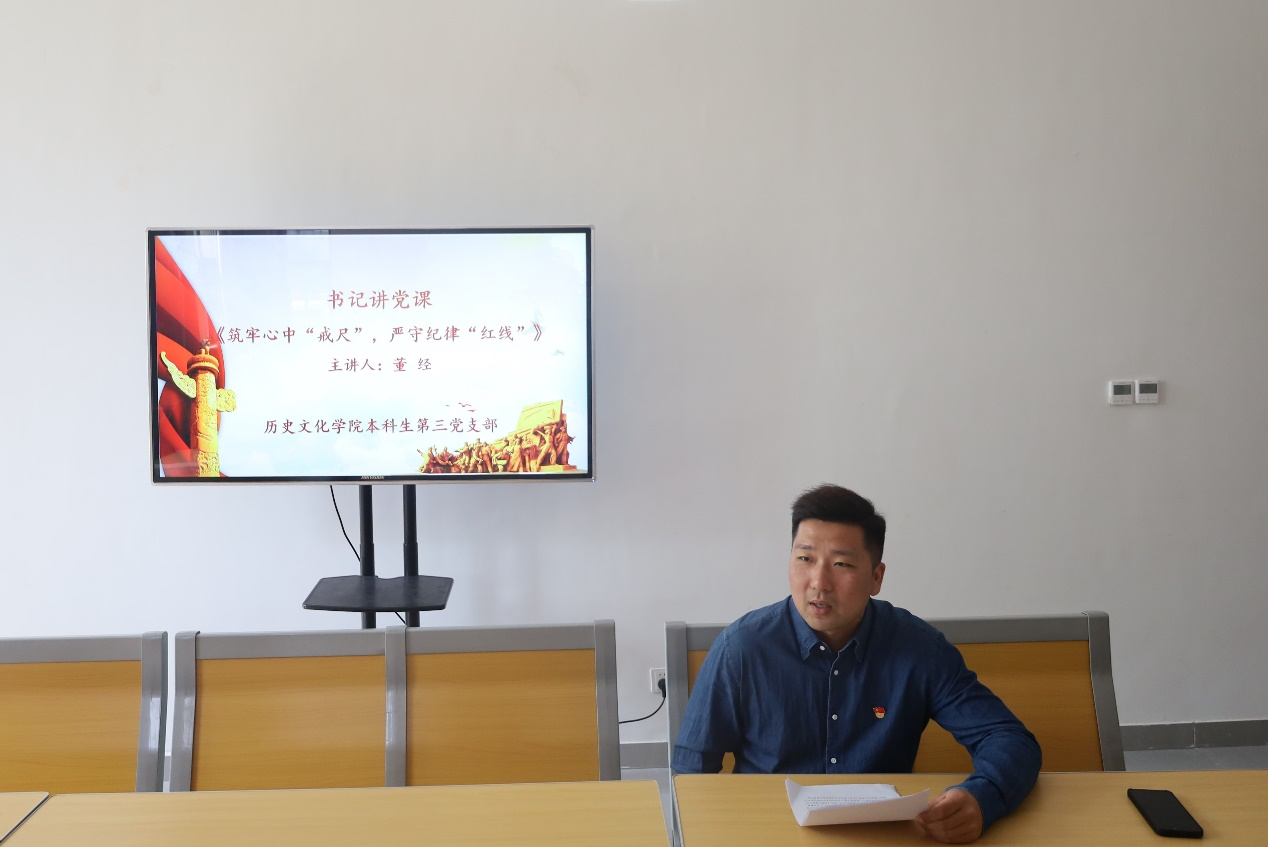 会上,董经同志以《筑牢心中“戒尺”,严守纪律“红线”》为题,为支部全体党员讲授专题纪律党课。董经从确保纪律意识“铭记于心”、确保纪律要求“践之于行”、确保纪律教育“贯穿始终”、确保纪律忠诚“干净担当”四个方面带领全体本科生第三党支部党员展开学习。