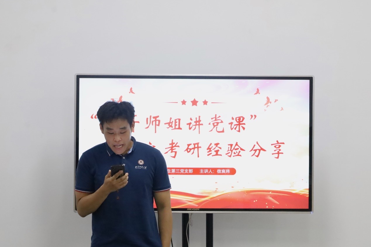 会议进行第二项,宿宸玮同志结合自身考研经验,给与会同志提出三条建议:第一,在正式备考之前,熟悉考研的相关流程和规则;第二,应当对于自身的学习能力和已具备的知识水平形成较为清晰的认识,选择合适的目标;第三,根据自己的学习节奏和学习方法制定各科目学习计划。随后,宿宸玮同志以自身的考研经历为例,就考研过程中的心态调整、备考过程中的学习计划、本专业考研的相关资料等方面讲述了自己的方法。