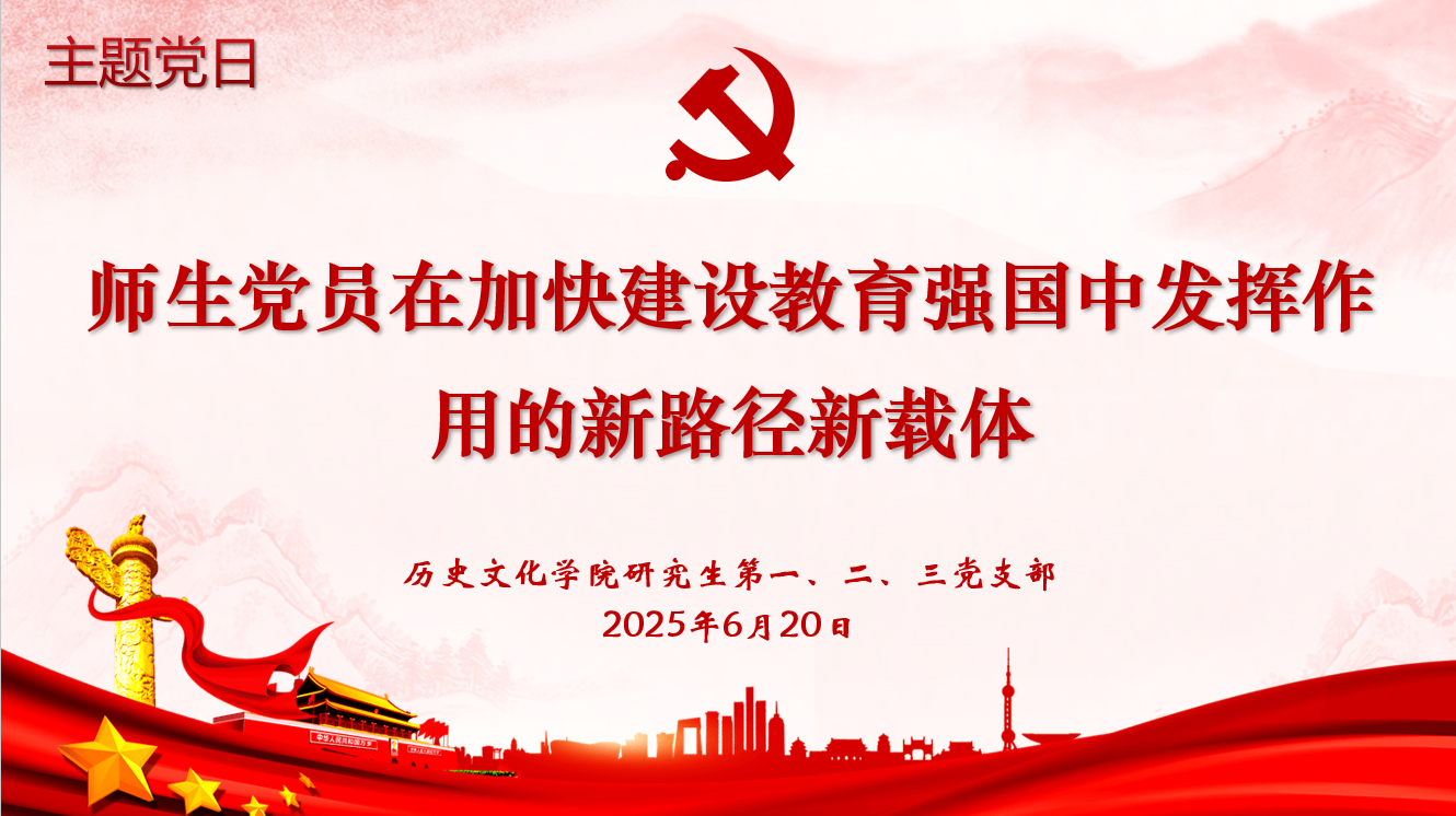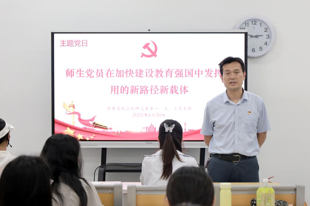 在之后的主题党日活动中,与会党员就“师生党员在加快建设教育强国中发挥作用的新路径新载体”这一主题进行了集中研讨。第一党支部石洋菁苡表示应立足历史学科优势,推动学术研究与教育实践深度融合。第二党支部宿宸玮表示应立足“立德树人”根本任务,推进乡村教育以促进教育公平。第三党支部高子涵表示应以创新驱动文化传承,用青春表达激活历史教育。