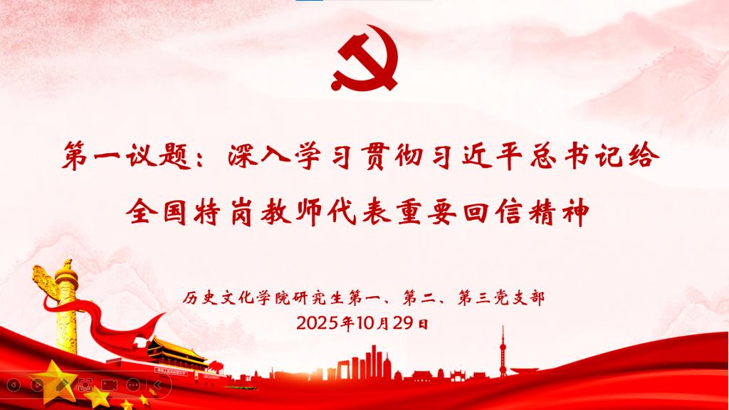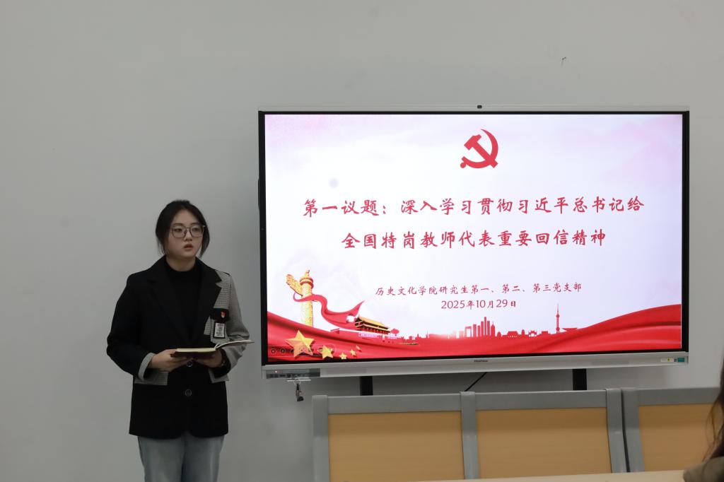 2025年10月29日下午,足球直播515官网 研究生第一、第二、第三党支部在孔子书院B106教室联合开展10月份主题党日活动,研究生党支部全体党员通过线上线下相结合的方式参加会议。会议由研究生第一党支部书记孙锋主持。