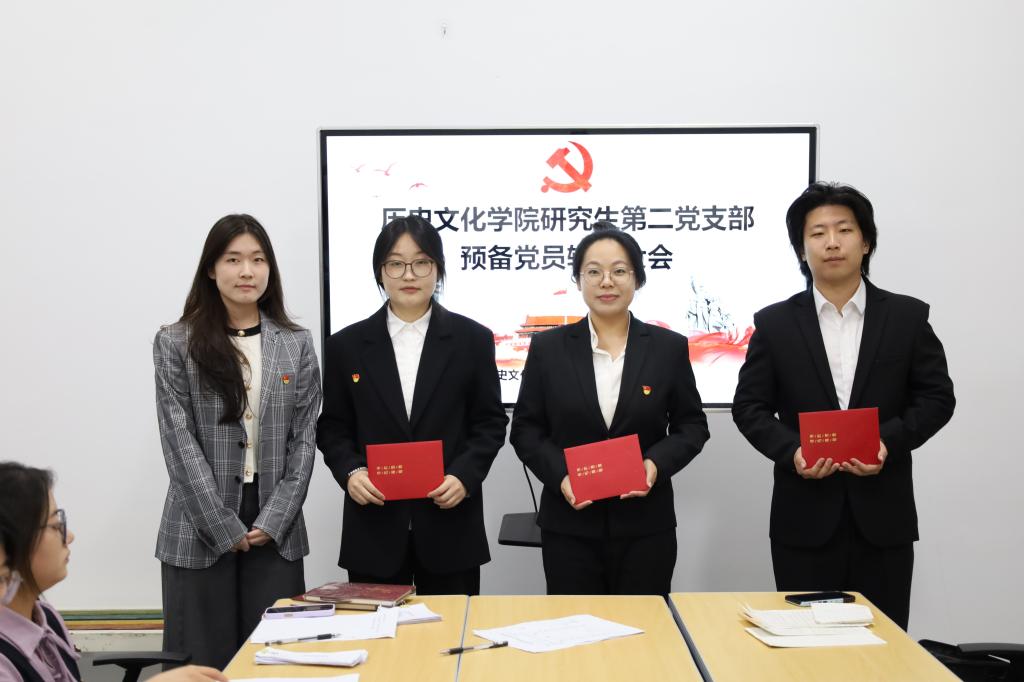 最后,孙锋、杨紫依、李美琪分别代表各自支部为4名转正党员同志颁发了政治生日贺卡,为7名新接收的预备党员同志颁发了党徽和党员学习笔记,并进行总结发言,对4名党员同志顺利转正,7名同志加入党组织表示祝贺,希望他们能够坚守初心、砥砺前行,在将来的学习、工作和生活之中,继续发挥党员模范作用。