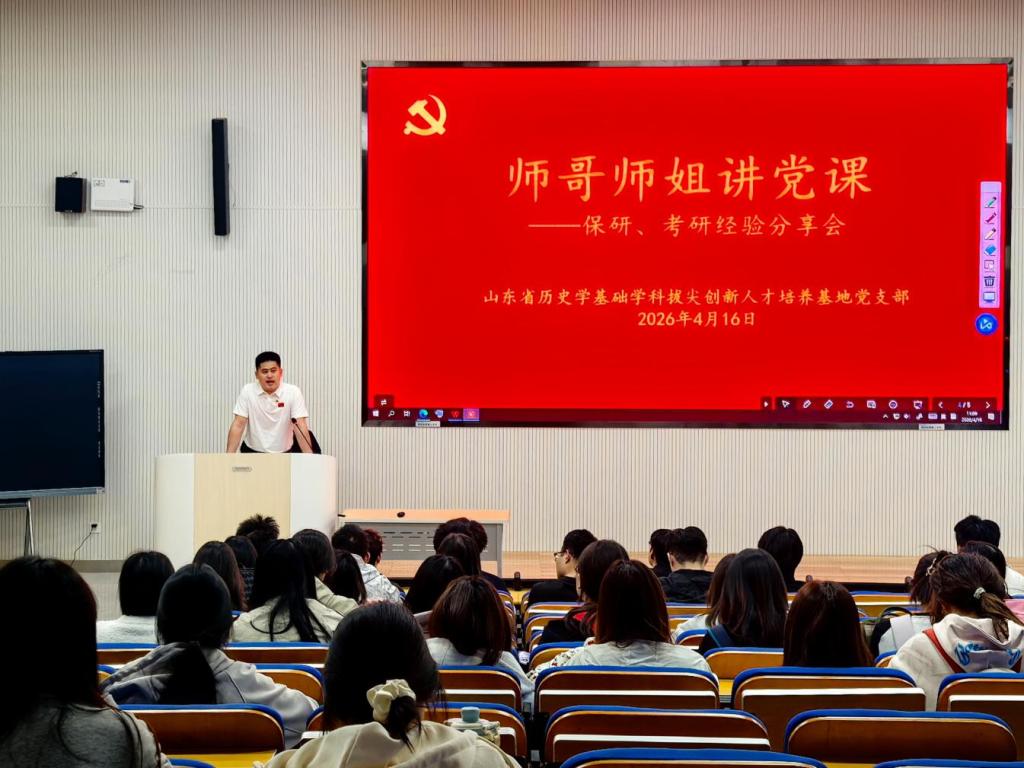 4月16日上午,足球直播515官网 山东省历史学基础学科拔尖创新人才培养基地党支部组织开展“师哥师姐讲党课”系列活动,党员高凯月、李琪在2024级国学班、文化产业管理班、文物与博物馆学班开展保研、考研经验分享和考研升学启蒙教育活动。