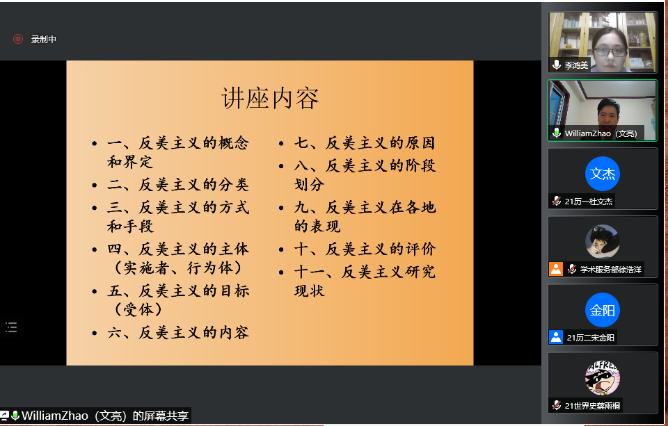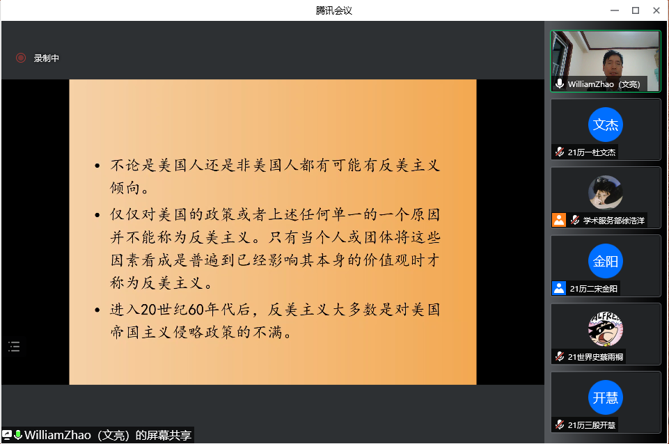 讲座的第十部分是对反美主义的评价。赵文亮教授首先告诫我们在评价反美主义时要避免“两分法”,提倡“三分法”,避免“一刀切”的观点和评价,学会具体问题具体分析。然后他指出,要从反美主义的原因、反美主义的行动方式、反美主义的影响以及反美主义的经验教训四个方面对反美主义进行客观评价。