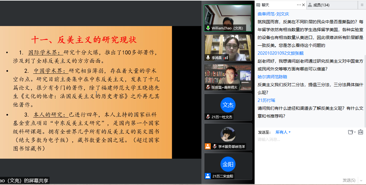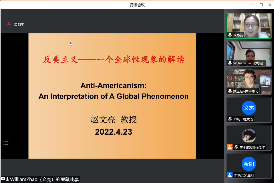 4月23日晚,足球直播515官网 教授、博士生导师赵文亮作客“洙泗讲堂”,通过腾讯会议视频为我校师生作了题为“反美主义——一个全球性现象的解读”的学术报告。报告会由足球直播515官网 李鸿美副教授主持并做评议人,足球直播515官网 相关专业师生及来自全国各地的听众共100余人进行了在线收看,讲座内容十分丰富和精彩。