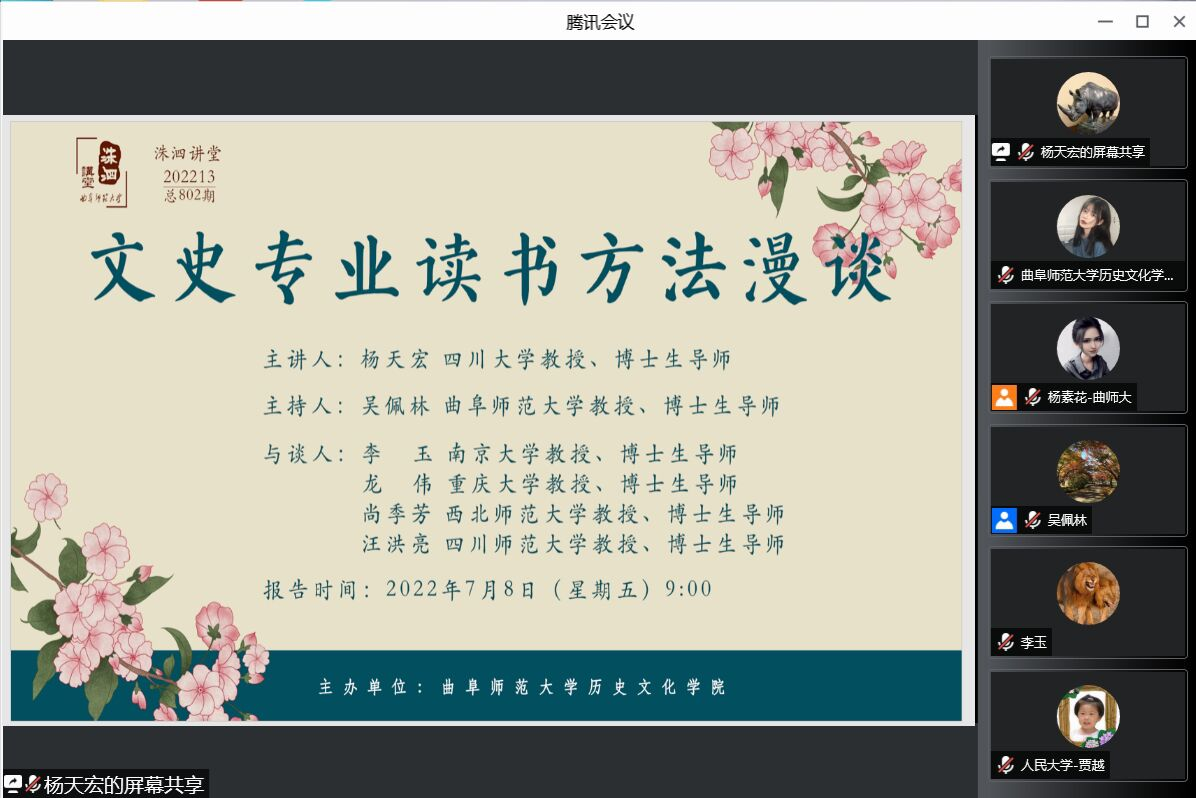为让学生度过一个有意义的暑假,2022年7月8日上午9点早,足球直播515官网 以讲座的形式开启了暑期读书计划。本期讲座主题为“读书六法:朱熹读书方法演绎”。 主讲人为四川大学教授、博士生导师杨天宏教授。讲座由足球直播515官网 吴佩林教授主持,南京大学李玉教授、四川师范大学汪洪亮教授、重庆大学龙伟教授、西北师范大学尚季芳教授、中国人民大学刘贤副教授担任与谈人。讲座采取腾讯会议直播的方式进行,相关专业师生及线上听众共300余人参加了此次活动,讲座内容十分精彩。