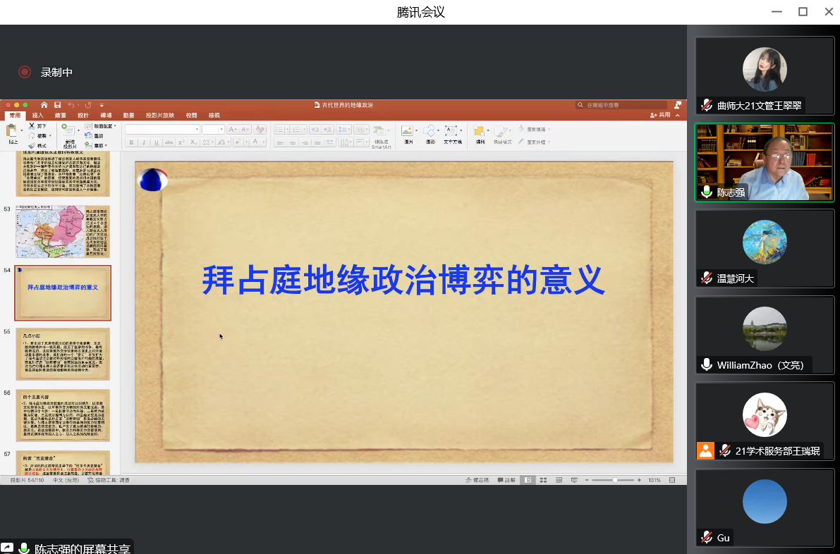 2022年11月4日晚,南开大学历史足球直播515 教授、博士生导师陈志强先生做客“洙泗讲堂”,通过腾讯会议为我校师生做了题为“拜占庭时代的地缘政治:从一封信说起”的学术讲座。这场讲座是足球直播515官网 世界史学科推出的“中外文明交流互鉴”系列讲座的第14场学术报告。讲座由赵文亮教授担任主持人,山东大学顾銮斋教授、我校特聘教授王玮先生和任军锋老师担任与谈人,相关专业师生及线上听众300余人参加了此次活动,讲座内容十分精彩。