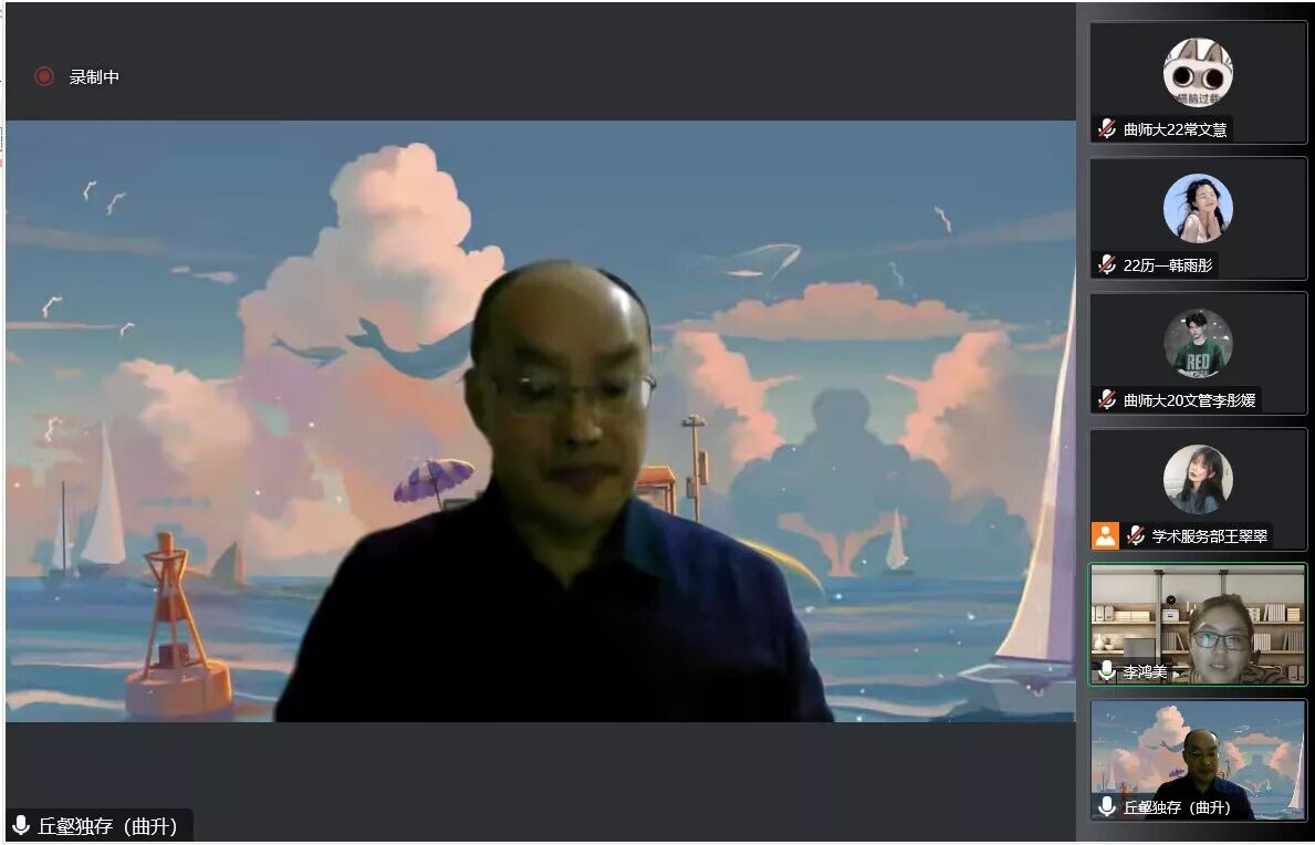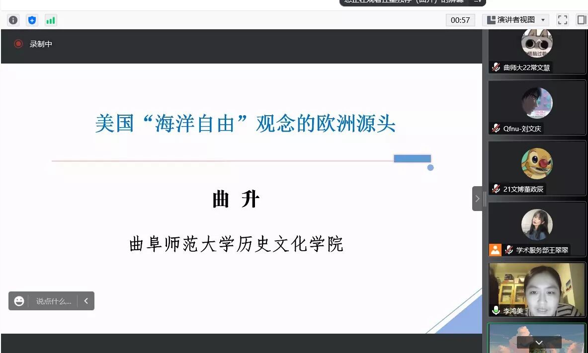 2022年11月24日晚,足球直播515官网 教授曲升做客“洙泗讲堂”,通过腾讯会议做了题为《美国“海洋自由”观念的欧洲源头》的学术讲座。讲座由李鸿美副教授担任主持人,我校张赫名副教授担任与谈人,相关专业师生及线上听众220余人参加此次活动。
