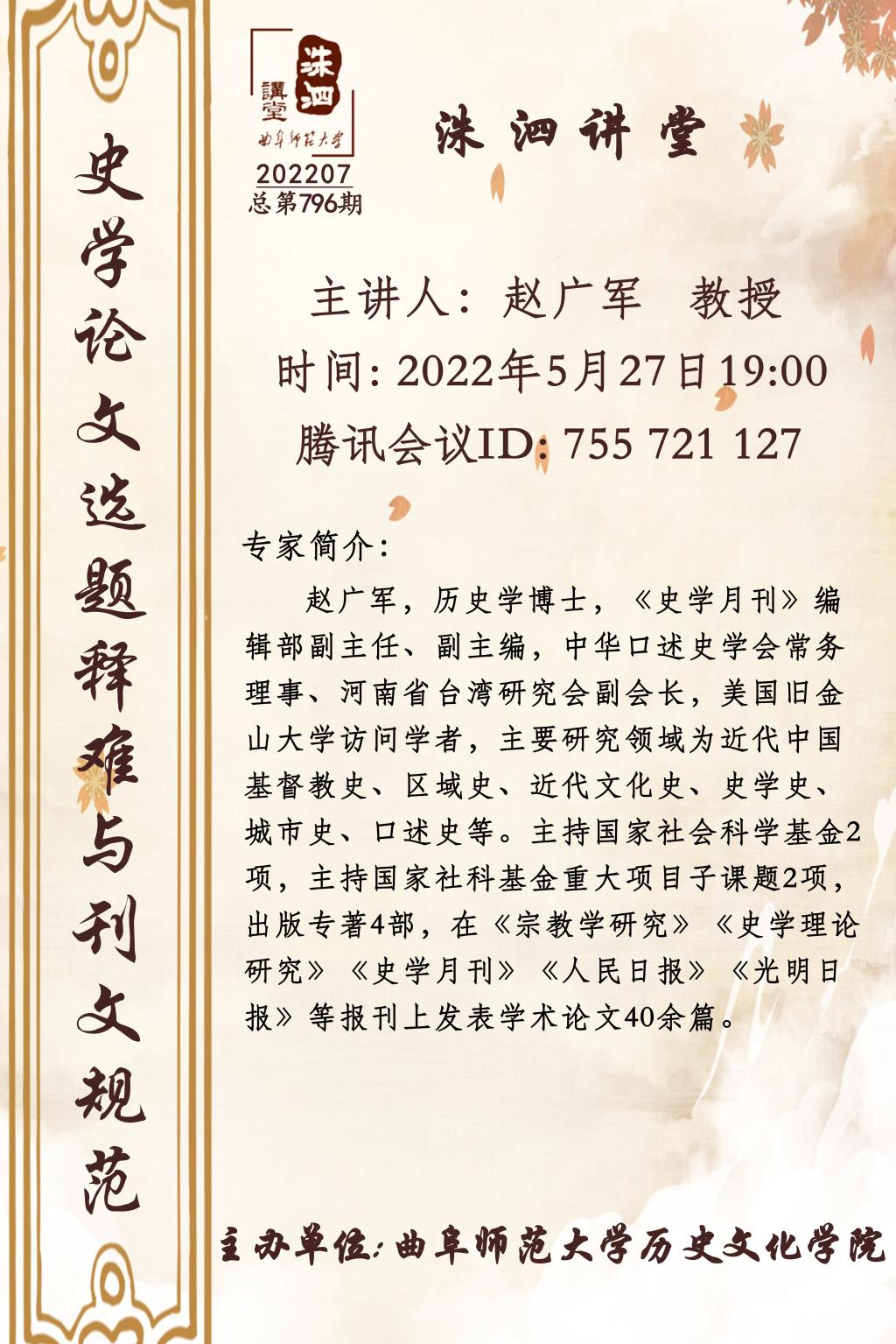 洙泗讲堂预告| 赵广军:史学论文选题释难与刊文规范