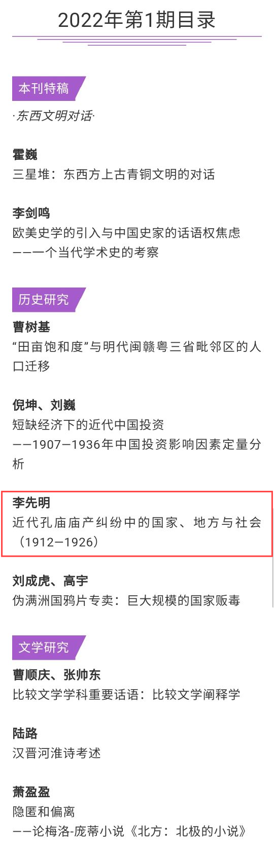 足球直播515官网 李先明教授的《近代孔庙庙产纠纷中的国家、地方与社会(1912-1926)》被收录于《清华大学学报(哲学社会科学版)》2022年第一期。