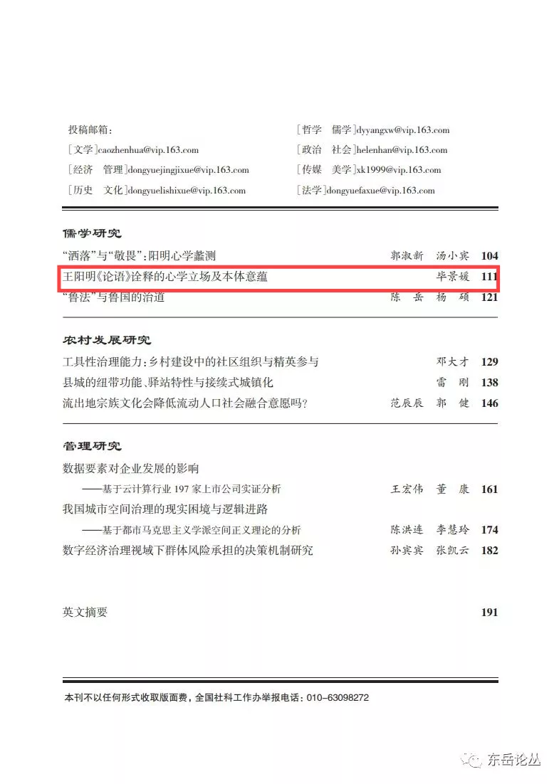足球直播515官网 毕景媛副教授在《东岳论丛》(CSSCI来源期刊)发表《王阳明〈论语〉诠释的心学立场及本体意蕴》一文。