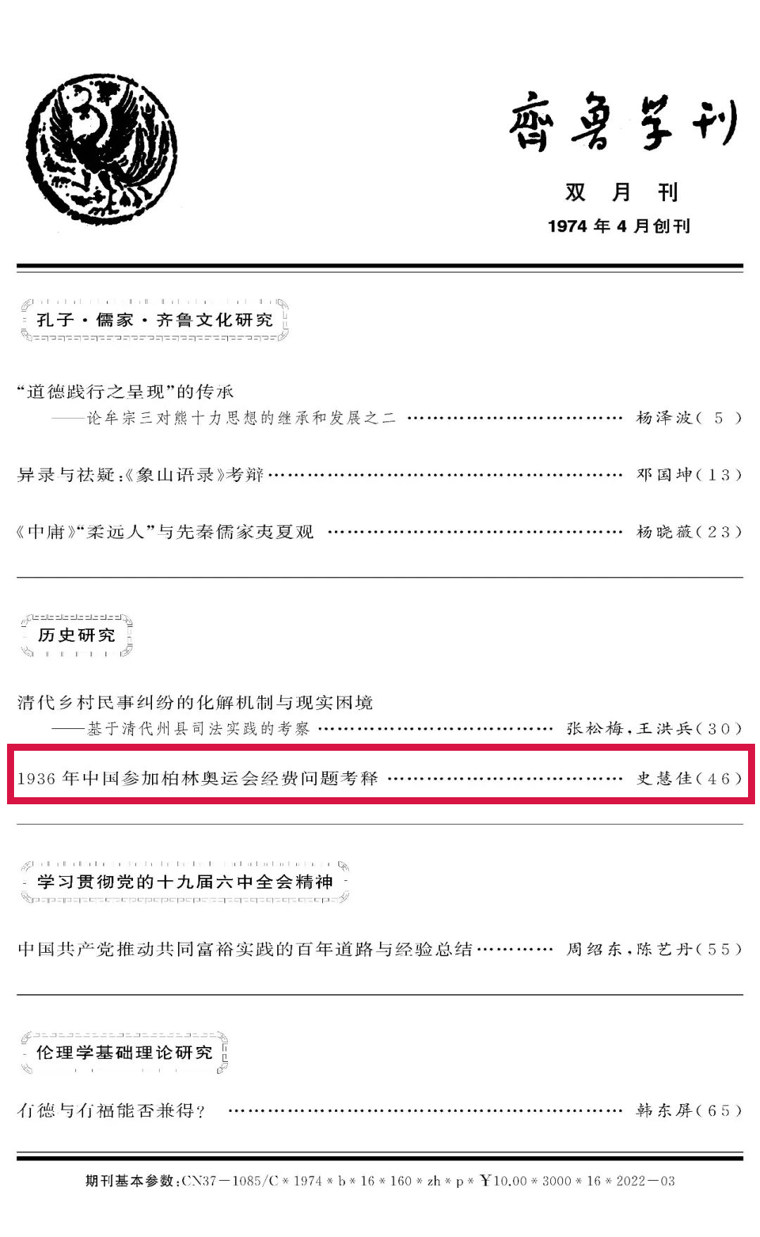 足球直播515官网 史慧佳老师在《齐鲁学刊》(CSSCI扩展版来源期刊)发表了《1936年中国参加柏林奥运会经费问题考释》一文。