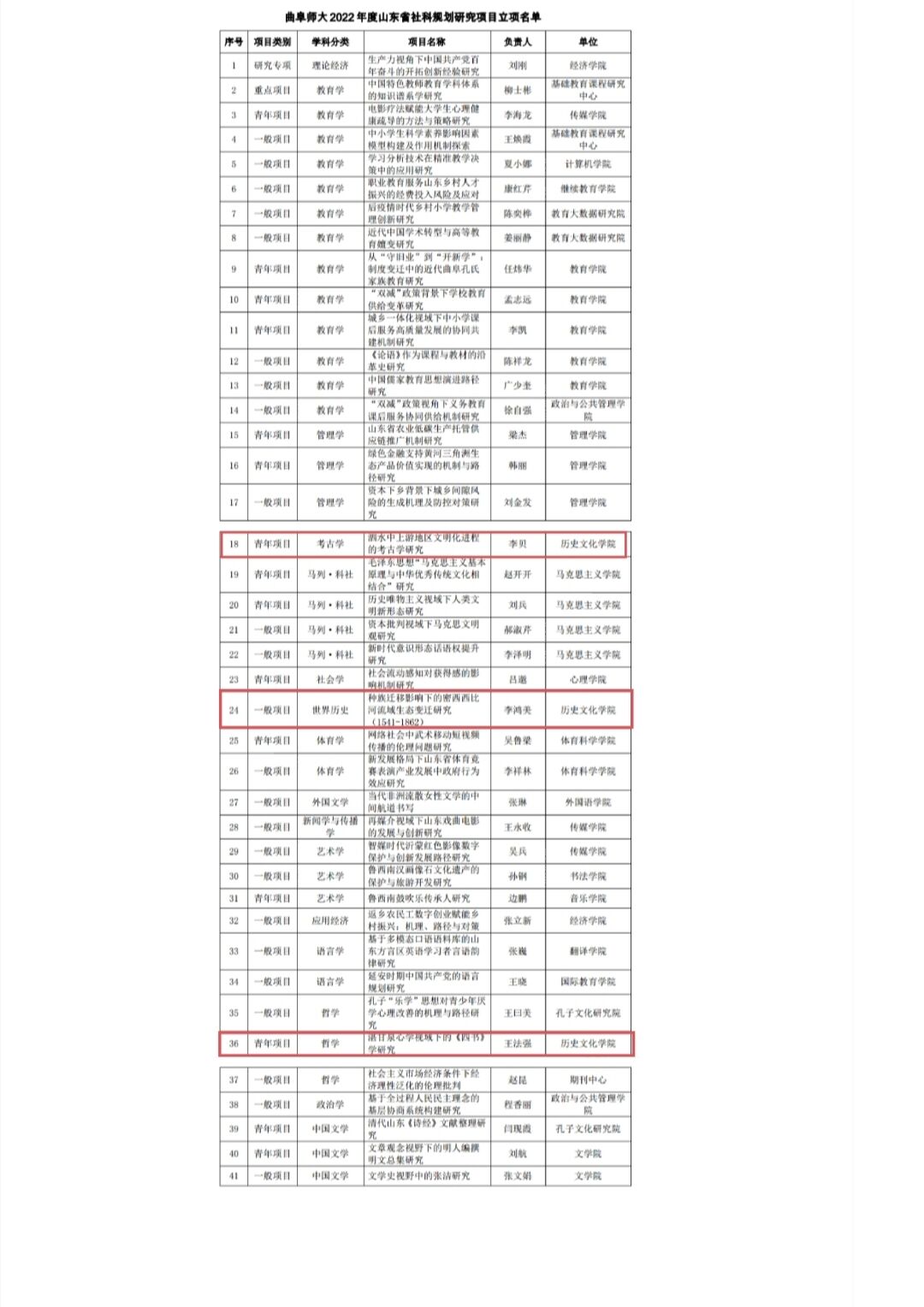 8月25日,山东省哲学社会科学办公室正式公布了2022年度山东省社科规划研究项目立项名单。足球直播515官网 获批三项,其中李鸿美老师负责的《种族迁移影响下的密西西比河流域生态变迁研究(1541-1862)”》获批一般项目,李贝老师负责的《泗水中上游地区文明化进程的考古学研究》、王法强老师负责的《湛甘泉心学视域下的<四书>研究》获批青年项目。