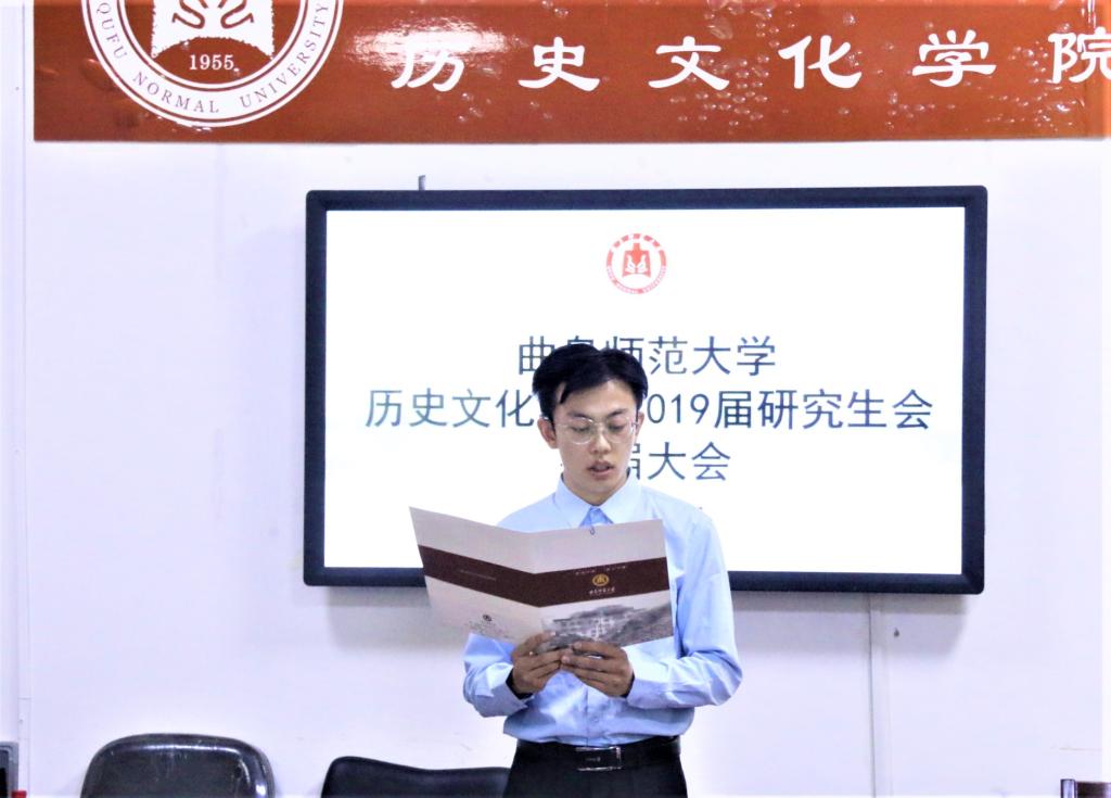 大会在庄严肃穆的国歌声中拉开了序幕,此次大会共包含九个流程。首先,2019届研究生会主席申潜结合足球直播515 去年一年的工作,从思想引领、学术研究、深化学生组织改革以及第二课堂等四个方面出发,作了述职报告。紧接着,王建阳、吕厚轩、孙锋、王法强老师为足球直播515 2019届研究生会主要学生干部颁发聘书。2019届研究生会副主席兼团委副书记魏子贺、副主席宗坤先后宣读了足球直播515 2020届研究生会主席团、部长任用名单。随后,足球直播515 2019届研究生会主席团成员与2020届主席团成员交接了“让优秀成为一种习惯”的牌匾。足球直播515 2020届研究生会主席孙永健进行就职表态发言。而后,徐璐、吕厚轩老师先后发表重要讲话。徐璐老师对足球直播515 换届大会表示了祝贺,对足球直播515 研究生会的一直以来的工作表现给予了高度肯定,希望新一届的研会成员继续传承“优秀是一种习惯”的优良传统,勇做学术的挑山工和生命的追光者。吕厚轩老师首先对2019届研究生会成员的辛勤付出表达感谢并提出了表扬,希望新一届的成员在接过接力棒后,能够继续加强兄弟院系、部门的交流合作,成就研会更辉煌的明天。继而,兄弟足球直播515 研会代表、孔子文化研究院研究生会主席曹苗苗为大会致贺词。最后,全体与会人员在文史楼前合影留念。