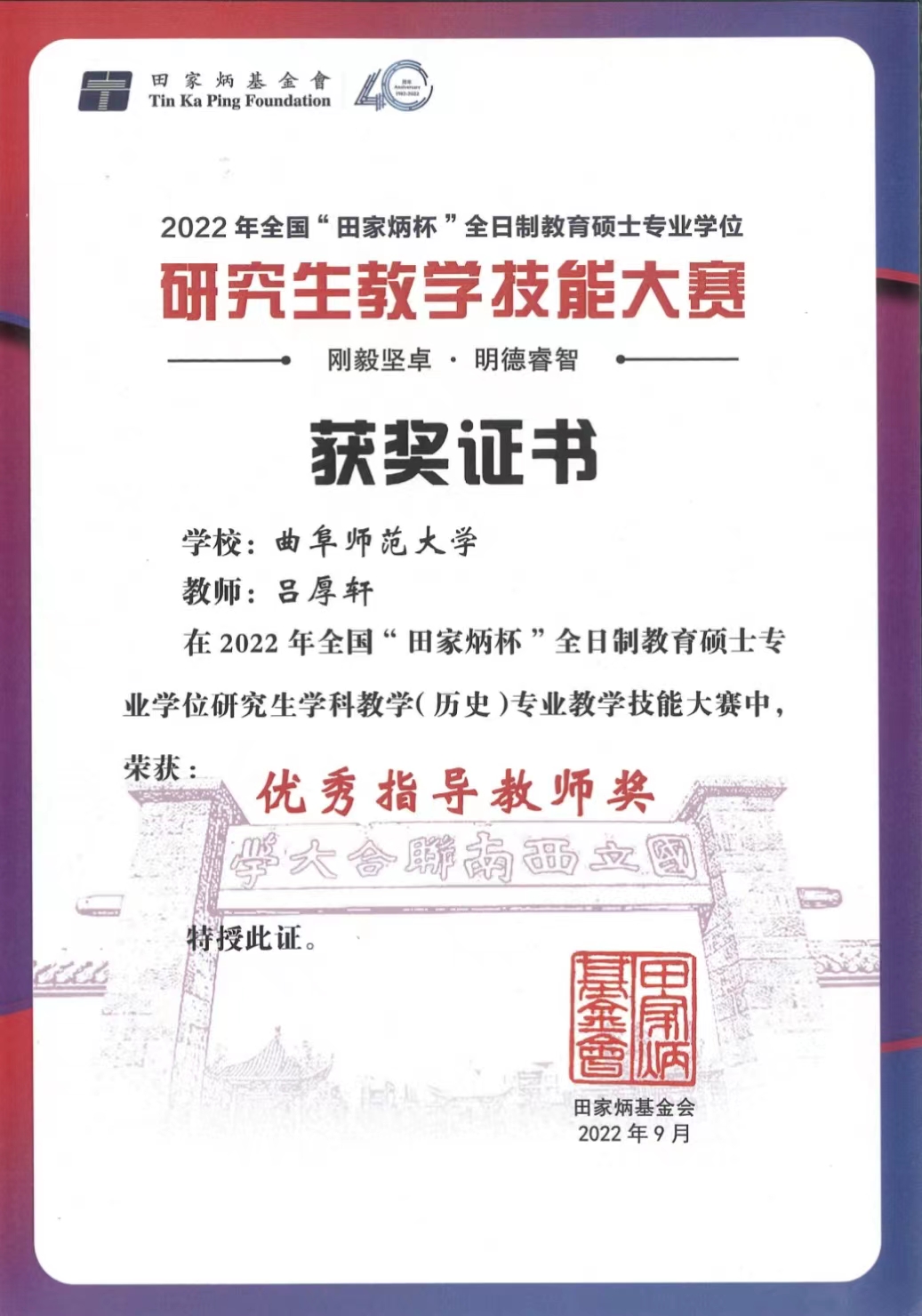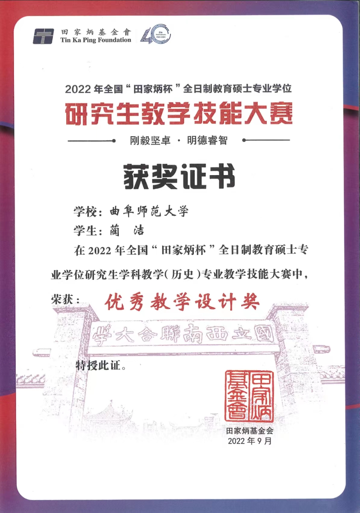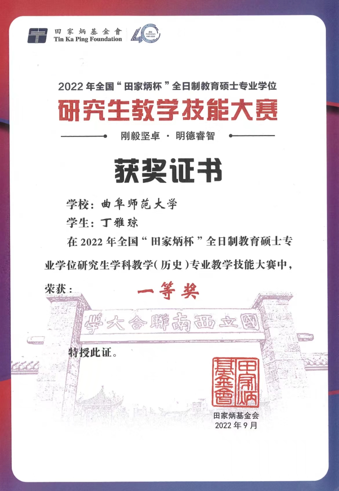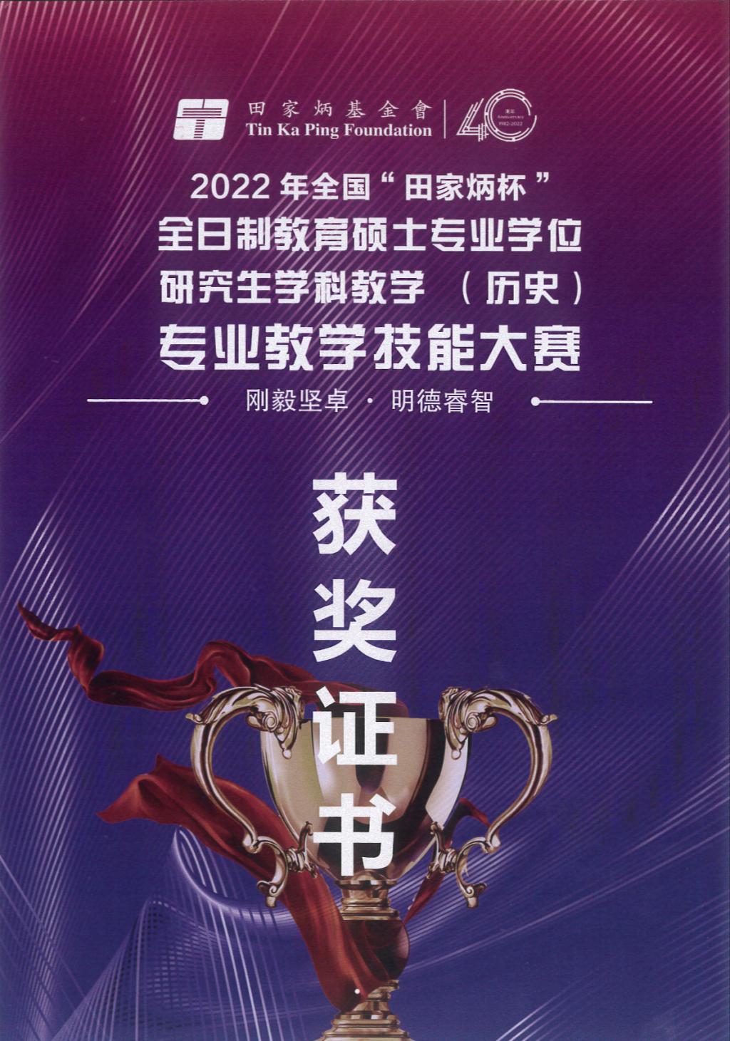 2022年6月27至28日,由全国教育专业学位研究生教育指导委员会主办、云南师范大学承办的2022年全国“田家炳杯”全日制教育硕士专业学位研究生学科教学(历史)专业教学技能大赛决赛成功举办。本次比赛通过线上形式举行,来自华东师范大学、华中师范大学、东北师范大学等全国73所院校的348名优秀参赛选手各展风采,展开一场高水平的教学技能较量。经过学校选拔和国赛初选,共有174名选手进入决赛,经决赛评审,共评选出一等奖18名,二等奖36名,三等奖52名,优秀教学设计奖34名。足球直播515官网 研究生丁雅琼(指导教师:吕厚轩)荣获一等奖,实现了足球直播515官网 学科教学(历史)教育硕士教学能力大赛的新突破!此外,足球直播515官网 研究生蔺洁(指导教师:张亚宁)荣获优秀教学设计奖,指导教师吕厚轩荣获“优秀指导教师”的称号。