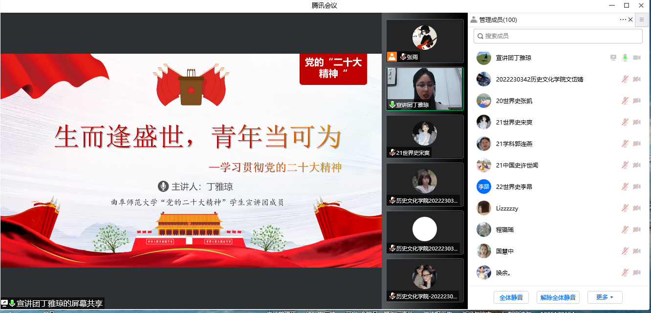 为深入学习宣传贯彻党的二十大精神,引导广大团员迅速把思想和行动统一到党的二十大精神上来,更好地团结引领团员听党话,跟党走。2022年12月5日晚,足球直播515官网 研究生团支部召开以“生而逢盛世,青年当可为”为主题的团课活动,活动通过腾讯会议线上进行。本次主题团课由曲阜师范大学“党的二十大精神”学生宣讲团成员丁雅琼主讲,足球直播515官网 团委副书记张雨主持,足球直播515官网 研究生辅导员孙锋老师及研究生团支部全体团员参加。