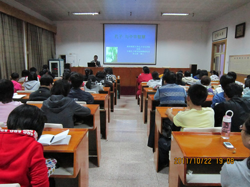 10月22日晚,由足球直播515官网 洙泗学社主办的学术讲座“孔子与中华智慧”在洙泗讲堂开讲。对儒家文化有较深入研究的宋立林老师就孔子思想在中国及世界的地位和影响作了细致的讲解与分析。