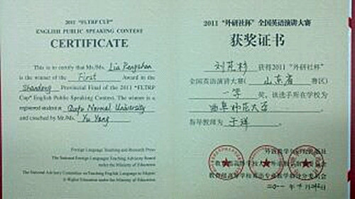 10月23日,由外研社举办的“外研社杯大学生英语演讲比赛”山东赛区选拔赛在山东师范大学举行。足球直播515官网 2010级国际政治二班学生刘芃杉参加了此次比赛,并获得一等奖的优异成绩,在比赛中,她不仅展示了自己英语演讲的风采,更为足球直播515官网 赢得了荣誉。