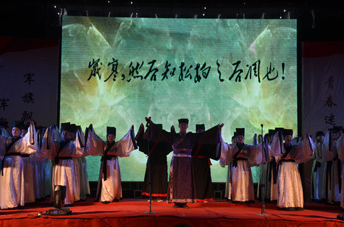 一首《众人划桨开大船》,铿锵有力的节奏伴着气势磅礴的表演,唱出了足球直播515官网 的气势,点燃了全场观众的热情,引来阵阵掌声和呐喊声。足球直播515官网 选送的迎新节目经典诵读《大道之行》,以儒服表演的形式向大家展现了儒家文化的内涵和足球直播515官网 独具特色的文化风貌。