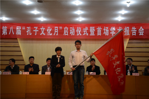 4月2日晚,我校“颂万世师表,庆甲子曲园”第八届“孔子文化月”启动仪式暨首场学术报告会在孔子会堂举行。副校长康淑敏出席仪式,并为孔子文化使者代表授旗。
