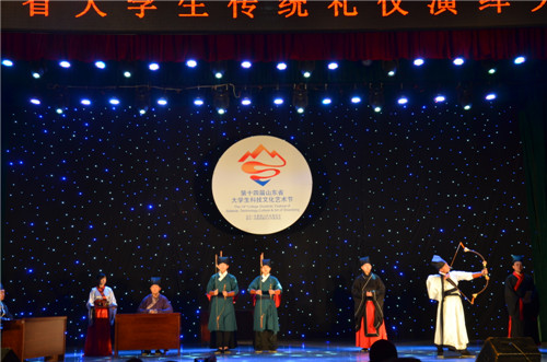 5月30日,在第十四届山东省大学生科技文化艺术节传统礼仪演绎大赛中,足球直播515官网 “羲和华韵”表演队代表我校赴鲁东大学进行射礼展演。