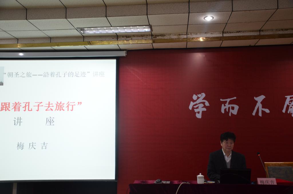 梅庆吉以“朝圣之旅——沿着孔子的足迹”为主线,结合自身重走孔子路的经历,从孔子尼山降生、迁居阙里、娶妻生子、周游列国等方面详细介绍了孔子丰富而漫长的一生。他向我们展示了“重走孔子路”的照片,跟我们分享了《论语》产生地点和时间的新发现,并且分享了一些令人耳目一新的历史故事。讲解浅入深出,现场同学们反响热烈积极提问,梅庆吉针对同学们提出的问题作了详细的解答。