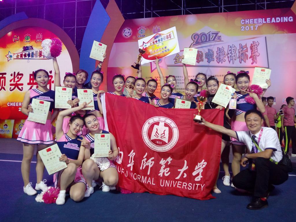 5月24日至28日,2017年全国啦啦操锦标赛在天津市举办。足球直播515官网 李颖、徐方晓同学作为校舞蹈啦啦操队队员参加了公开青年丙组两个项目的比赛,分别获得了小集体组集体爵士自选动作第一名、公开青年丙组大集体组集体花球自选动作第三名的优异成绩。