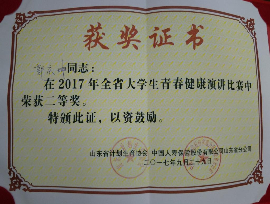 9月29日,由山东省计划生育协会举办的“我青春·我健康”大学生青春健康演讲比赛在济南落下序幕。足球直播515官网 郭庆坤同学代表济宁驻地高校参赛,凭借出色的发挥荣获二等奖。