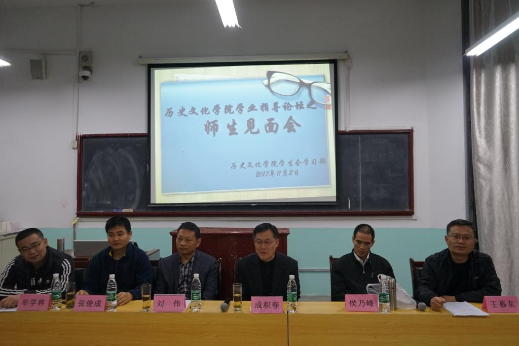 11月2日晚,足球直播515官网 2017级国学专业师生见面会在文史楼309教室举办。足球直播515官网 成积春、王慕东、刘伟、侯乃峰、张俊成、牟学林六位老师出席了见面会。见面会由王慕东主持。