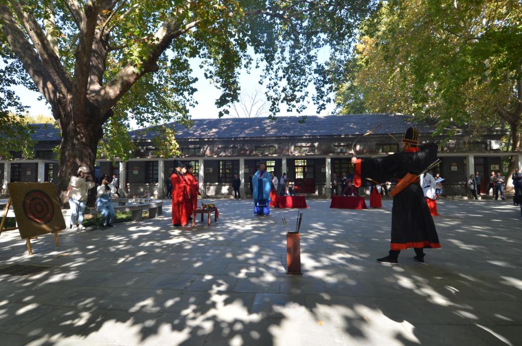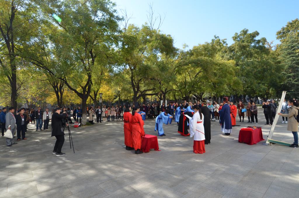 综合楼前广场上,随着弦和之乐缓缓奏起,传统礼仪展演队成员们身着汉服,头顶儒冠,在三圣画像前按照传统礼仪仪程展演“束脩礼”。西联广场前,同学们进行了射礼的展演。庄严、古朴的礼仪展演深深吸引了在场观礼的老师嘉宾,在独特的儒家氛围中,以彬彬古礼展现出尊师明道的深厚文化底蕴。