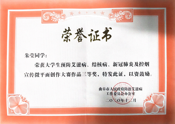 近日,由曲阜市人民政府防治艾滋病工作委员会办公室组织举办的大学生预防艾滋病、结核病、新冠肺炎及控烟宣传微作品创作大赛圆满落幕。足球直播515官网 学子朱莹积极参加比赛,并在大学生预防艾滋病、结核病、新冠肺炎及控烟宣传微平面创作中荣获三等奖。
