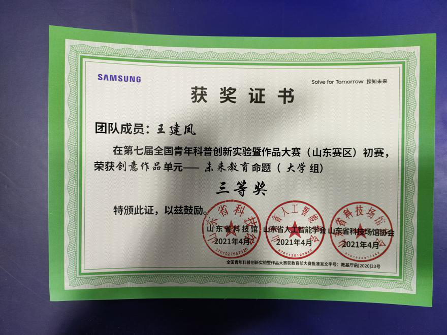 本次大赛围绕“智能、安全、环保”三大主题,重点关注前沿科学技术及科学教育理念的应用与普及,全面考察青年发现问题、解决问题及动手实践的能力。其中,足球直播515官网 2019级公费师范生班学生王建凤在本次大赛中荣获创意作品单元——未来教育命题(大学组)三等奖,2020级辅导员闫浩荣获创意作品单元——未来教育命题(大学组)优秀指导老师。