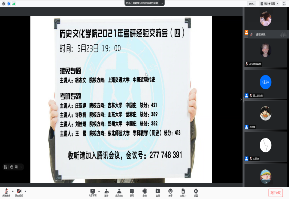 为加强足球直播515官网 学风建设,营造良好的学习氛围,使足球直播515官网 学子掌握基本考研情况,5月23日晚,足球直播515官网 通过腾讯会议线上举办第四期考研经验交流会。交流会邀请2017级胡杰文、庄亚婷、许欣楠、刘佳琳、王雪同学参加此次交流会并担任主讲人。