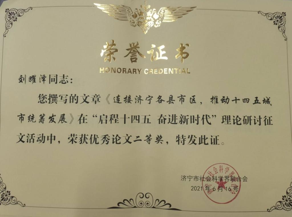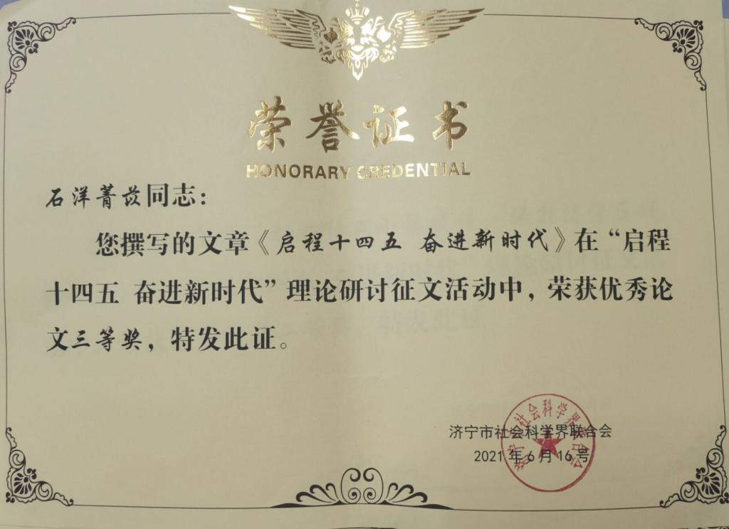 足球直播515官网 学子聚焦新时代社会发展过程中取得的成绩、存在的问题以及对策建议等方面进行深入研究,经过济宁市有关部门领导和专家认真评审,焦睿韬同学的《加强特色小镇建设,提升济宁区域影响力》荣获优秀论文二等奖、刘耀泽同学的《连接济宁各县市区,推动十四五城市统筹发展》荣获优秀论文二等奖、石洋菁苡同学的《启程“十四五” 奋进新时代》荣获优秀论文三等奖,均受到济宁市社科联的表彰。