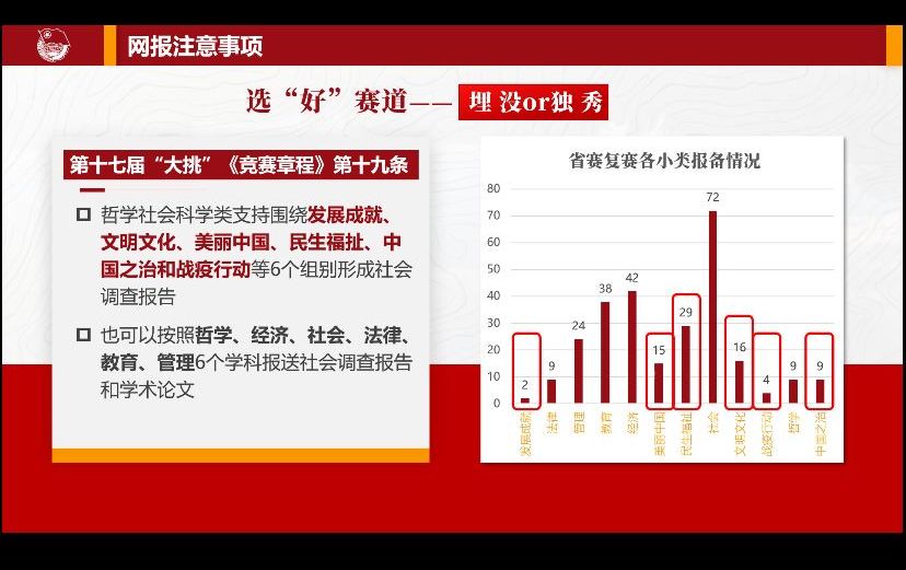 培训会以“‘挑战杯’大学生创新计划竞赛解析”为主题,从网报注意事项、把握网评特点以及“挑战杯”系列赛事概述三个方面展开对同学们的培训指导。焦健重点讲解了选“好”赛道的重要性,他列举了省赛复赛各小类报备情况,用数据展示了不同类别的参赛作品在复赛中的占比情况,强调选“好”赛道是成功的第一步。同时,他指出专家推荐、顾问以及专利等知识产权材料在项目中必不可少。而后,焦健对“挑战杯”系列赛事进行了基本讲解,他强调:双创的舞台的核心是全国高校人才培养、视野眼光的硬比拼,没有半点投机取巧的空间,完全是真刀真枪。最后,焦健耐心的解答了同学们提出的疑问。
