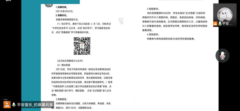 为提高同学们的国家安全知识素养,增强同学们的辨别能力,足球直播515官网 于3月11日以线上形式开展大学生国家安全知识竞赛学习动员会。本次活动由足球直播515官网 安全与权益部组织开展,会议主讲人为足球直播515官网 安全与权益部副部长彭楚涵。