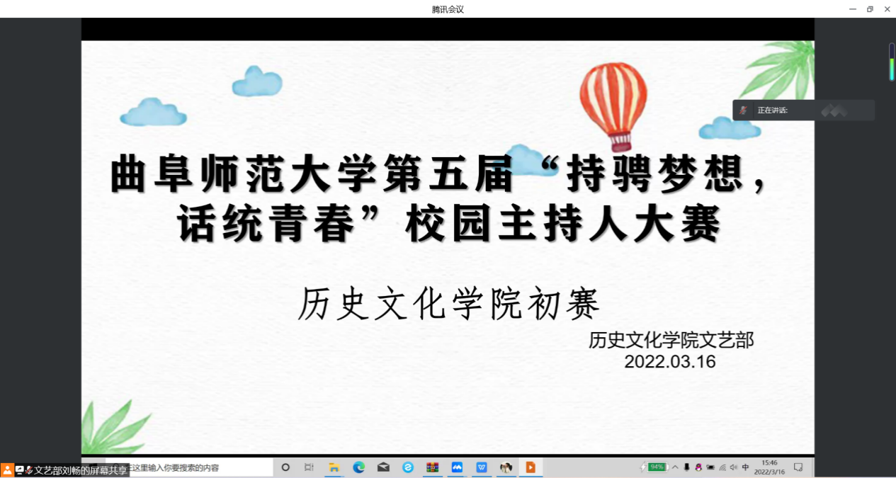 为丰富足球直播515官网 学子课余生活内容、提升足球直播515官网 学子自我谈吐能力,3月16日,足球直播515官网 于线上举办第五届“持骋梦想,话统青春”校园主持人大赛初赛。足球直播515官网 团委副书记王红宇、吕依琳以及学生会主席兰鸽、副主席刘吉、窦鲁豫、宫志伟、宿宸伟、大学生传统礼仪研修中心主任林欣、第四届校园主持人大赛冠军王子涵出席比赛并担任评委。