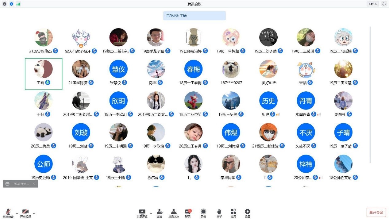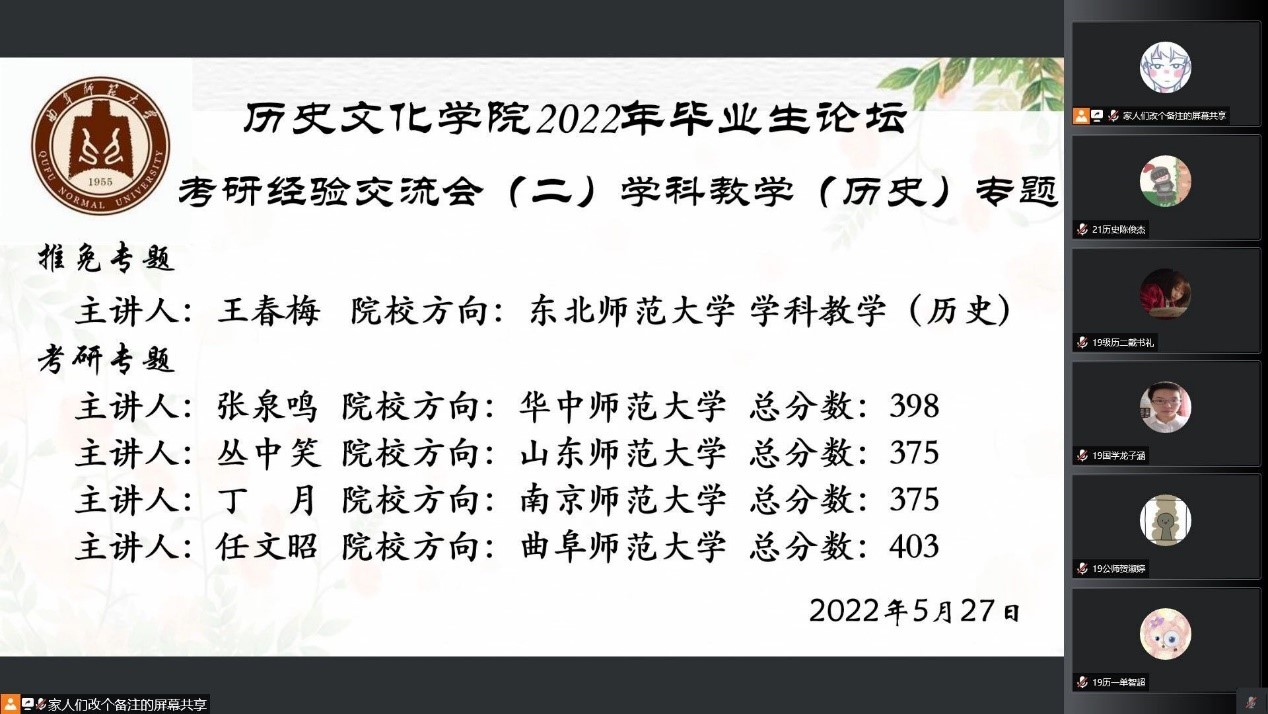 为解决考研学子的备考问题,激发同学们学习热情和考研激情,增强同学们考研的信心和决心,5月27日,足球直播515官网 成功举办考研经验交流会(二)——学科教学(历史)专题。本次交流会以线上形式进行,邀请2018级考研成绩优异的王春梅、张泉鸣、丛中笑、丁月、任文昭五位同学参加并担任主讲人,2018级王晗同学担任会议主持人。