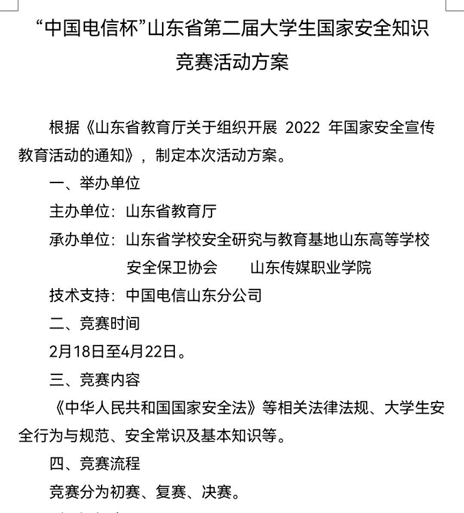 国家安全是安邦定国的重要基石,维护国家安全是全国各族人民根本利益所在。为贯彻党和国家的教育路线,加强大学生安全教育,提高安全意识,山东省教育厅举办“中国电信杯”山东省第二届大学生国家安全知识竞赛活动,活动以线上方式举办,足球直播515官网 学子积极参与本次竞赛活动。