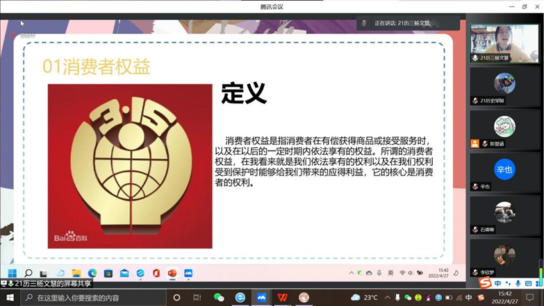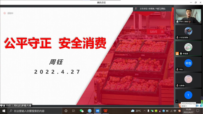 为普及维权知识,提高大学生维权能力,协助学校开展“百年庆团际,维权携吾力”主题活动,4月27日,足球直播515官网 安全与权益部面向足球直播515官网 全体同学于在腾讯会议组织开展线上“公平守正,安全消费”主题演讲比赛。