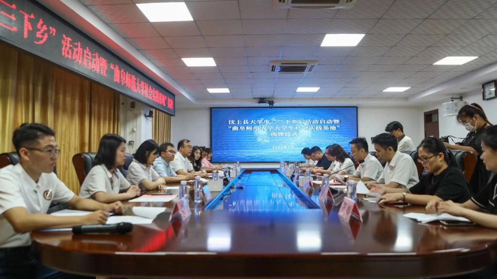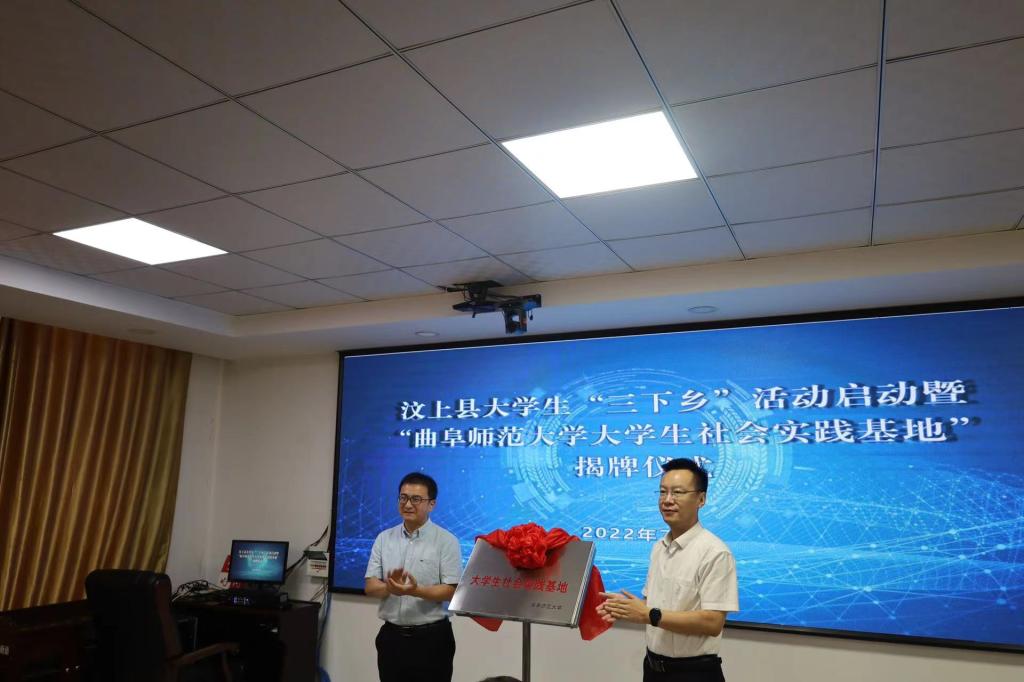 会上,林毅书记对我校社会实践队表示欢迎和支持,我校社会实践队员代表介绍社会实践项目。高聪书记和孔轶众书记共同为“曲阜师范大学大学生社会实践基地”揭牌,吴德强部长和王建阳书记共同为“曲阜师范大学党史小课堂”揭牌。揭牌结束,孔轶众书记指明了校地合作的美好前景,对“三下乡”活动进行了动员部署。仪式最后,李小雪书记指出挂牌建立大学生社会实践基地,是汶上县与我校深化合作的新开端。仪式结束后,参会领导观看了我校社会实践团队传统礼仪展演。