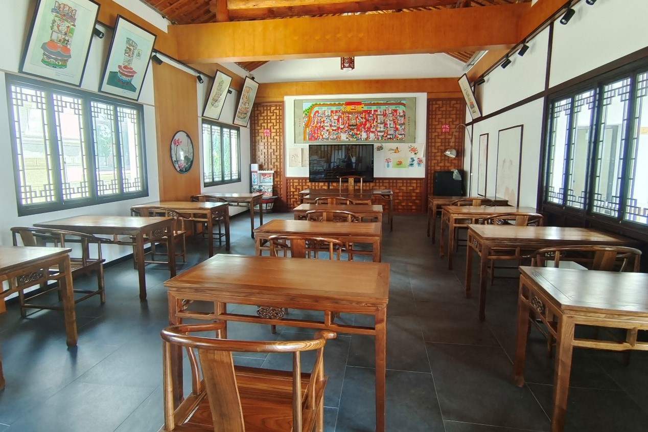在实践活动中,团队成员在灶画手艺人陈万林老先生的带领下走进古塘村,观赏了各式各样、风格迥异的灶头画模型。在参观过程中,队员有幸拜访了灶画传承人施顺观老先生。经采访,队员了解到施老自18岁开始学泥工,24岁独立打灶头、画灶头,27岁就在当地声名鹊起,于2007年被评为浙江省第一批非物质文化遗产灶头画传承人,2016年开展全国现代民间绘画研习班,2018年被授予“嘉兴市民间艺术家”荣誉称号。施顺观老先生带领队员参观了他的工作室,详细介绍了灶头自唐以来的历史沿革、各种灶画作品背后的历史故事以及美好寓意、各种灶头类型。为传承非遗文化储备新生力量,保留文化命脉,施老每周日为村里村外慕名而来的灶画爱好者、孩子们开办灶画艺术传承课,躬行践履,竭尽全力地让孩子们感受到传统灶画的魅力。