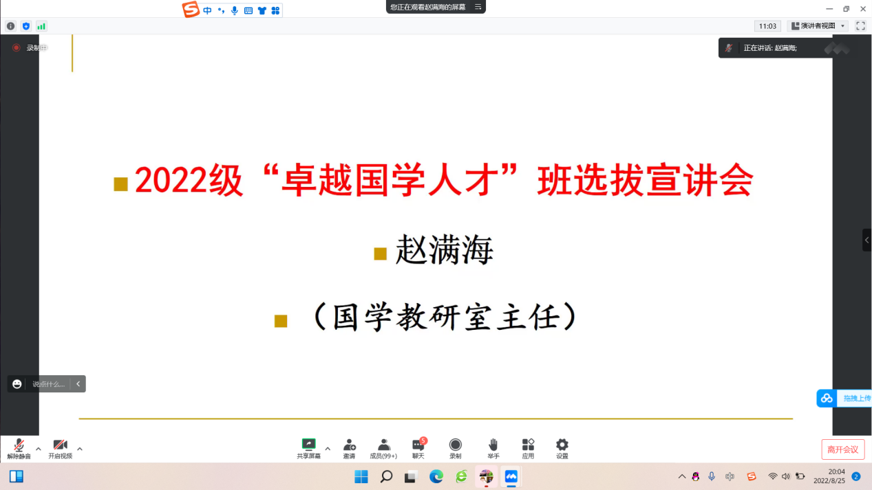 8月25日,足球直播515官网 举行2022级“卓越国学人才班”选拔宣讲,国学教研室主任赵满海担任主讲人,并以腾讯会议的形式向2022级新生宣讲国学班的内容。 赵满海首先从国学班的办学缘由讲起,主要针对国学班的培养目标、课程体系、配套措施以及办学成绩四方面向同学们进行了详细介绍。他向同学们说明了“卓越国学人才班”注重经典研读,力图打通学科界限,致力于培养基础扎实、视野开阔的研究型国学人才的办学理念。并且,赵满海强调“卓越国学人才班”立足师范教育,肩负起培养优秀国学师资力量的责任。最后,同学们提出疑惑,赵满海针对同学们的问题进行了一一解答。 本次宣讲的举办,使2022级新生对“卓越国学人才班”有了更多更深入地了解,为足球直播515官网 2022级“卓越国学人才班”的选拔及培养工作奠定了坚实基础。