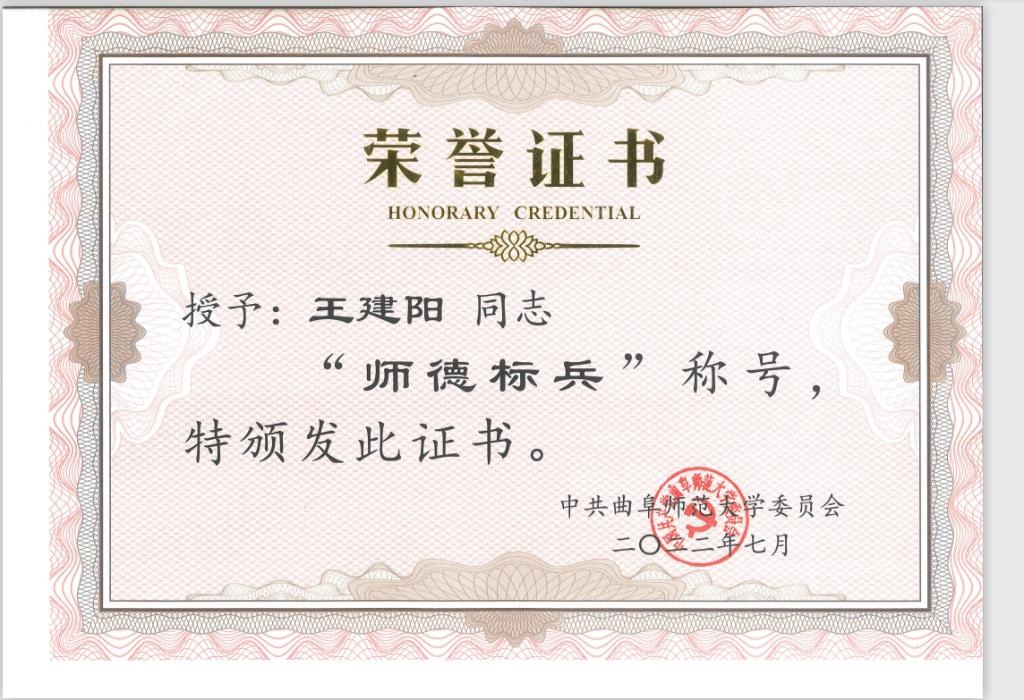 在此次表彰中,王建阳被评为曲阜师范大学2022年度“师德标兵”,姜修宪被评为曲阜师范大学2022年度“教书育人楷模”。