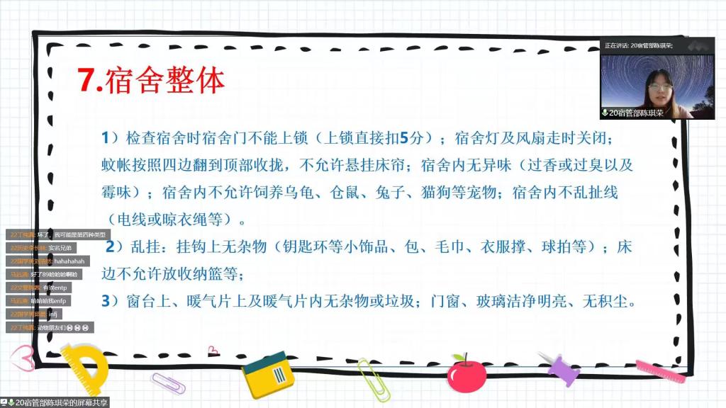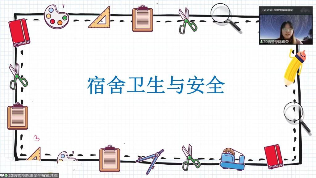 为推动新生宿舍的文明建设,创造整洁、文明、舒适、规范的生活环境,9月14日下午,足球直播515官网 于腾讯会议举办宿舍卫生与安全教育会议。宿管部陈琪荣担任主讲人,2022级全体新生参加会议。 会议上,陈琪荣就宿舍卫生检查标准和宿舍安全规范两部分进行详细讲解。在宿舍卫生检查方面,她向新生详细地介绍了宿舍打扫的技巧和检查标准,包括床底鞋子的摆放,床单被子的整洁,行李箱、脸盆、暖瓶的排列,阳台衣物的挂晾等。在宿舍安全规范方面,她重点强调了防火用电安全、违规电器检查及处罚、人身及财产安全保护和晚归检查四个方面。最后,陈琪荣对新生提出的问题给予了耐心的解答。